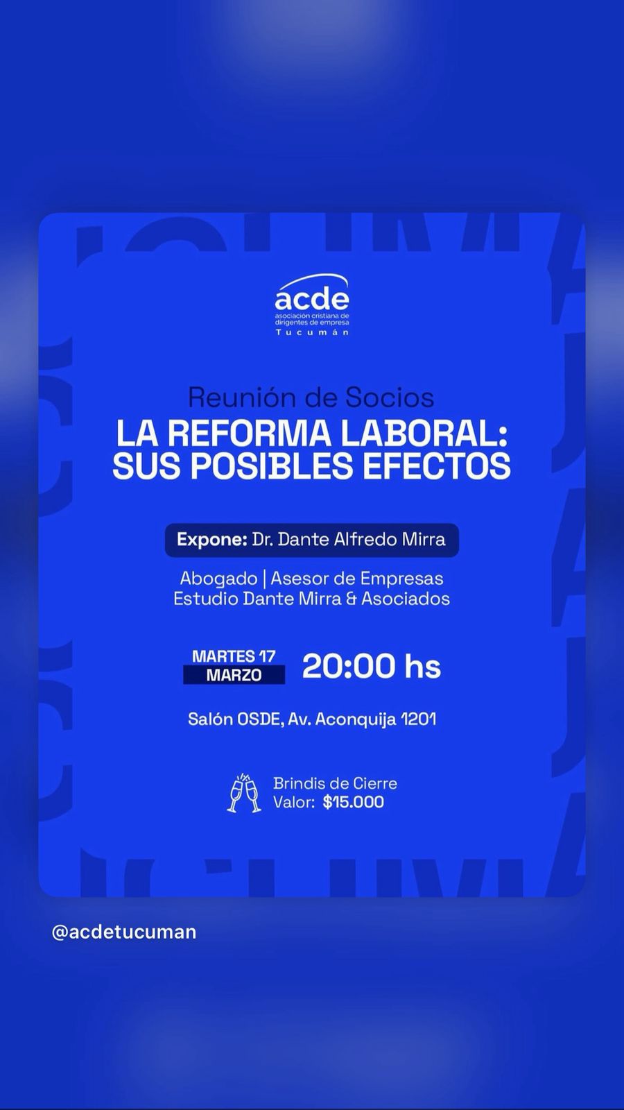 Reunión de socios de ACDE Tucumán sobre reforma laboral. Diserta el Dr. Dante Mirra. Incluye brindis y networking.