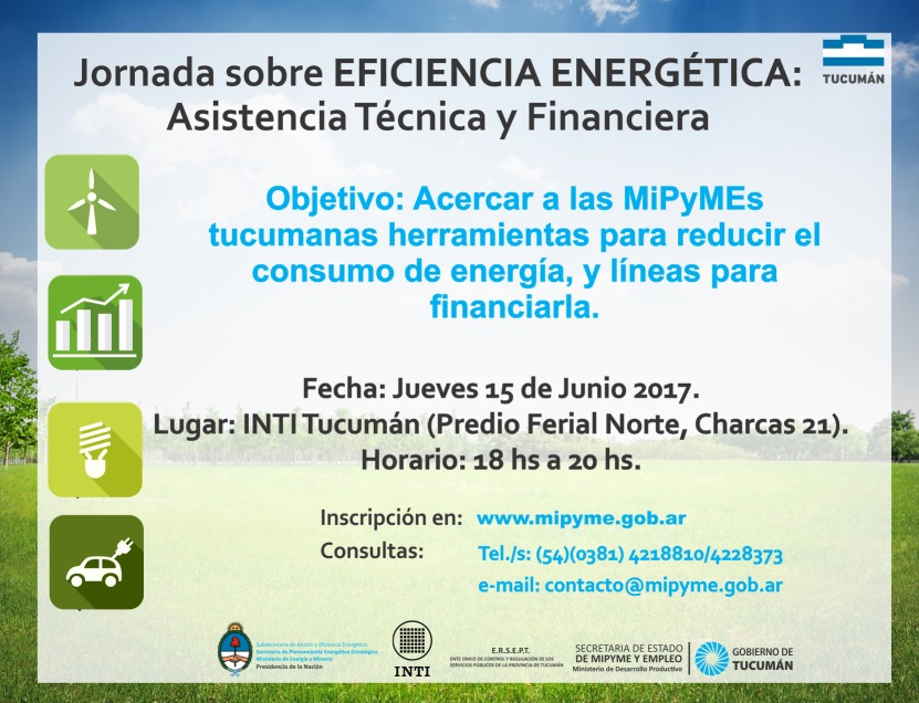 Estimados Empresarios, Desde la Subsecretaria de Mipyme tenemos el agrado de invitarlo a usted a participar de la Jornada de Eficiencia Energética, con el objetivo de acercar a las MiPyMEs tucumanas herramientas de capacitación técnica y asesoramiento acerca de la Línea de Financiamiento FONAPYME Eficiencia Energética (Monto: hasta $3.000.000; Tasa de interés: 9% fija y en pesos; […]