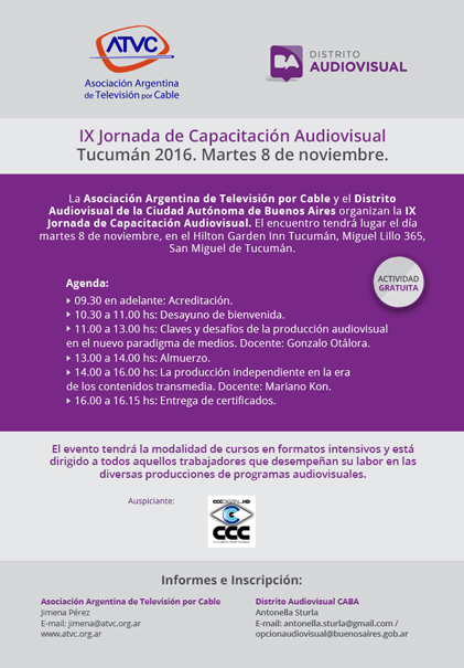 La ATVC (Asociación Argentina de Televisión por Cable) y el DISTRITO AUDIOVISUAL DE LA CIUDAD DE BUENOS AIRES organizan conjuntamente la IX JORNADA DE CAPACITACIÓN AUDIOVISUAL. El objetivo de esta actividad gratuita es brindar herramientas para que los productores audiovisuales del interior del país puedan aplicar conocimientos prácticos en su trabajo. Cada uno de los […]