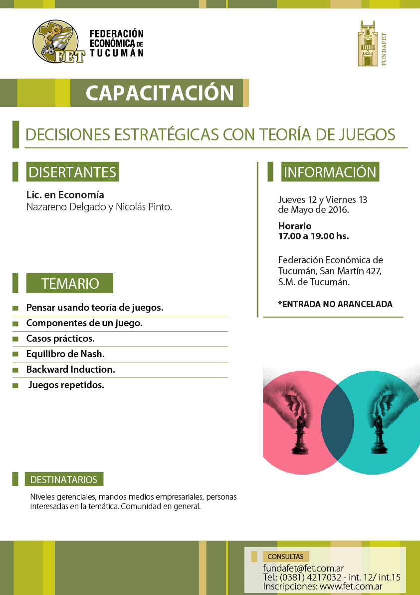 Disertantes: Lic. en Economía Nazareno Delgado y Nicolás Pinto Temario 1. Pensar usando teoría de juegos. 2. Componentes de un juego. 3. Casos prácticos. 4. Equilibro de Nash. 5. Backward Induction. 6. Juegos repetidos. Jueves 12 y Viernes 13 de Mayo 17:00 hs a 19:00 hs.