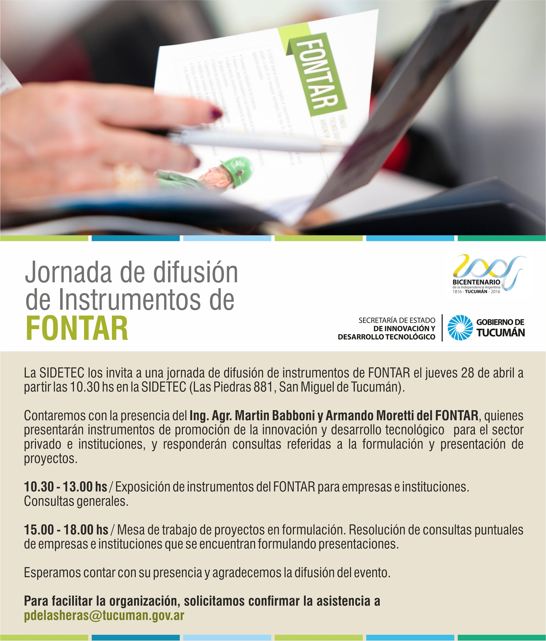 La SIDETEC los invita a una jornada de difusión de instrumentos de FONTAR el jueves 28 de abril a partir las 10.30 hs en la SIDETEC (Las Piedras 881, San Miguel de Tucumán). Contaremos con la presencia del Ing. Agr. Martin Babboni y Armando Moretti del FONTAR, quienes presentarán instrumentos de promoción de la innovación […]