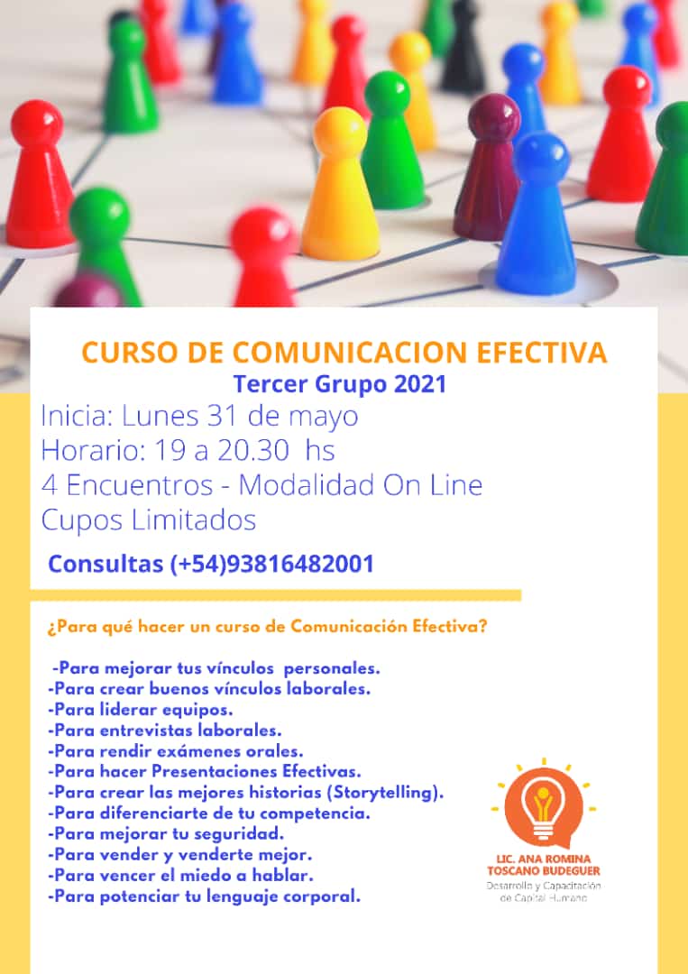 El día lunes 31 de mayo se llevará a cabo un nuevo curso de comunicación efectiva, dictado por la Lic. Ana Romina Toscano Budeguer. Una nueva oportunidad para crecer y aumentar tu seguridad. A continuación les dejamos más info…