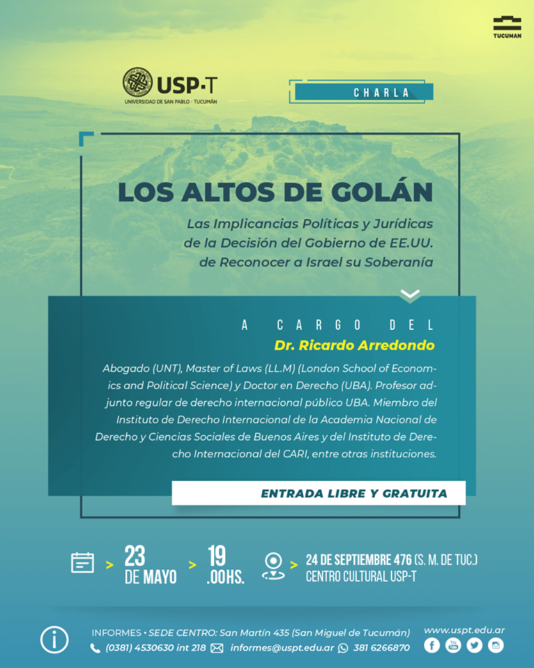 Conferencia “Los Altos de Golán: las Implicancias Jurídicas y políticas de la Decisión del Gobierno de EE.UU. de Reconocer a Israel su Soberanía” La charla estará a cargo del Dr. Ricardo Arredondo, especialista en Derecho Internacional. Fecha: 23 de Mayo Horario: 19 hs