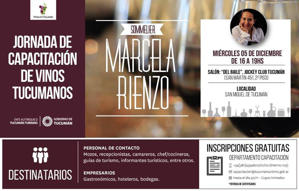 La sommelier Marcela Rienzo disertará sobre vinos tucumanos en una jornada organizada por el Ente Tucumán Turismo, con entrada libre y gratuita. En diciembre llega a la provincia la reconocida sommelier Marcela Rienzo , que dictará una capacitación en Vinos Tucumanos destinada a empresarios gastronómicos y a personal de contacto como mozos, cocineros, chefs, guías […]