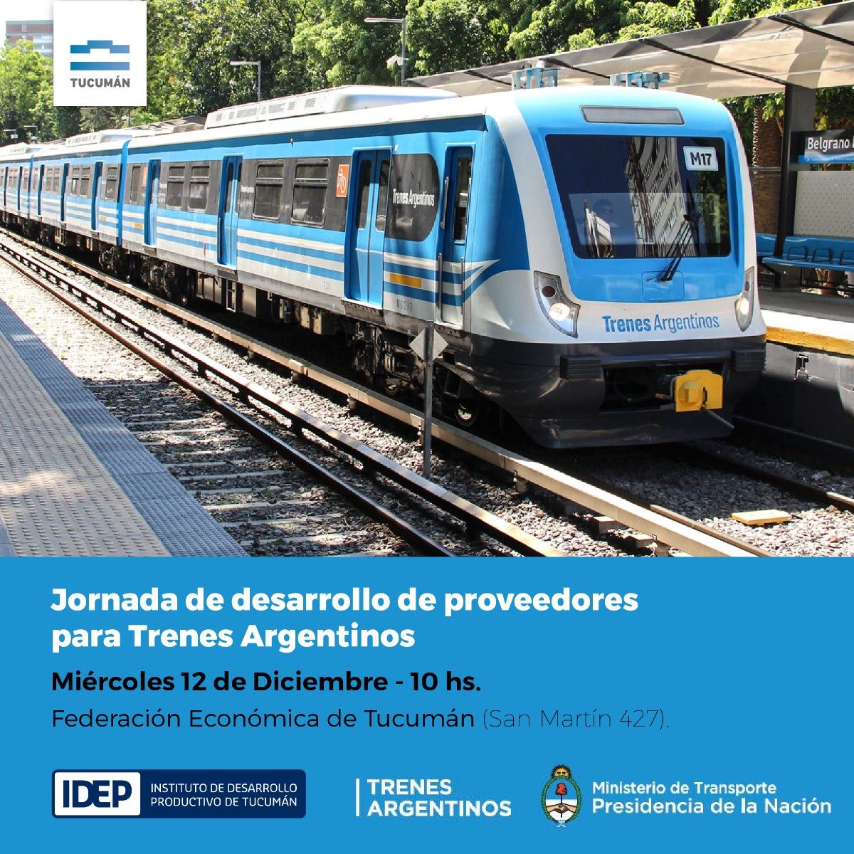 Hacemos extensiva la invitación del Instituto de Desarrollo Productivo de Tucumán (IDEP) para participar de la Jornada de Desarrollo de Proveedores para Trenes Argentinos. El evento tendrá lugar el miércoles 12 de diciembre a las 10 hs., en Federación Económica de Tucumán (San Martín 427, San Miguel de Tucumán). En esta oportunidad, la empresa Trenes […]