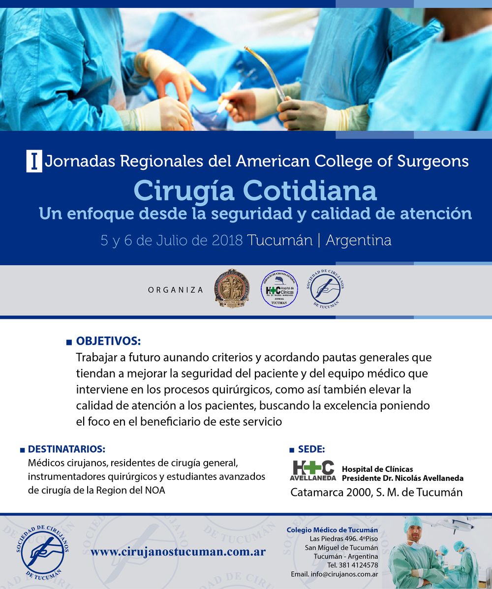 I Jornadas Regionales del American College of Surgeous Cirugía Cotidiana – Un enfoque desde la seguridad y calidad de atención Puede acceder a la web de la Sociedad de Cirujanos de Tucumán: http://cirujanostucuman.com.ar/