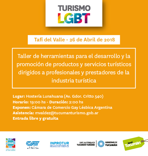 La cámara de comercio Gay Lésbica Argentina dictará el “Taller de herramientas para el desarrollo y promoción de productos y servicios turísticos dirigidos a profesionales y prestadores de la industria turística” que se realizará entre los días 26 y 27 de abril. Los lugares elegidos para dictar el taller cambian de acuerdo al día: 26 […]