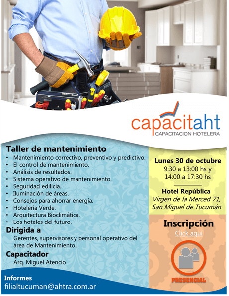 Lo invitamos a participar de la capacitación hotelera organizada por la AHT Filial Tucumán. Para mayor información comunicarse con filialtucuman@ahtra.com.ar. También puede visitar el siguiente sitio web.