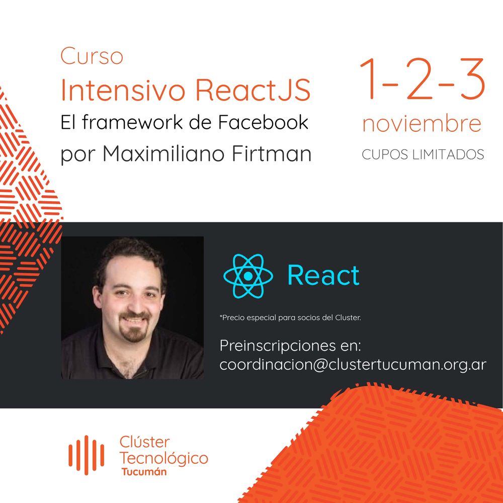 Los invitamos al Curso Intensivo de ReactJS, el framework de desarrollo utilizado en Facebook, que será dictado por Maximiliano Firtman el 01, 02 y 03 de Noviembre. Esta capacitación técnica, organizada por el Cluster, es realmente inédita para Tucumán y la región, cuenta con cupos limitados, y cabe señalar que el capacitador es un destacado […]