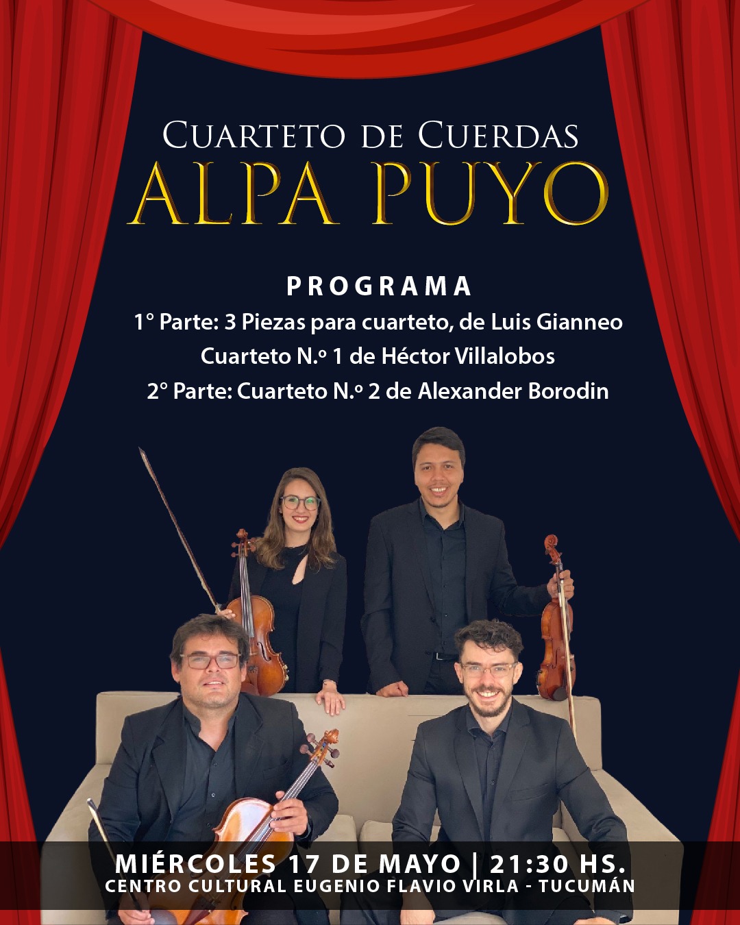 El próximo miércoles 17 de mayo, el Centro Cultural Eugenio Flavio Virla de Tucumán se llenará de armonía con la presentación del Cuarteto de Cuerdas Alpa Puyo.