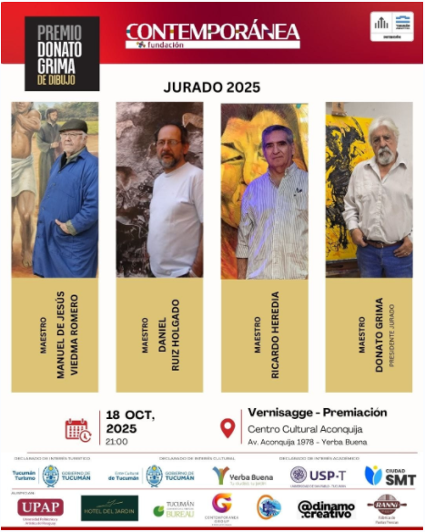 Finalmente, el sábado 18 de octubre a las 21:00 horas, en la sede de la Fundación Contemporánea (Centro Cultural Aconquija – Av. Aconquija 1978, Yerba Buena), se realizará el vernissage y la premiación del Premio Donato Grima de Dibujo 2025.