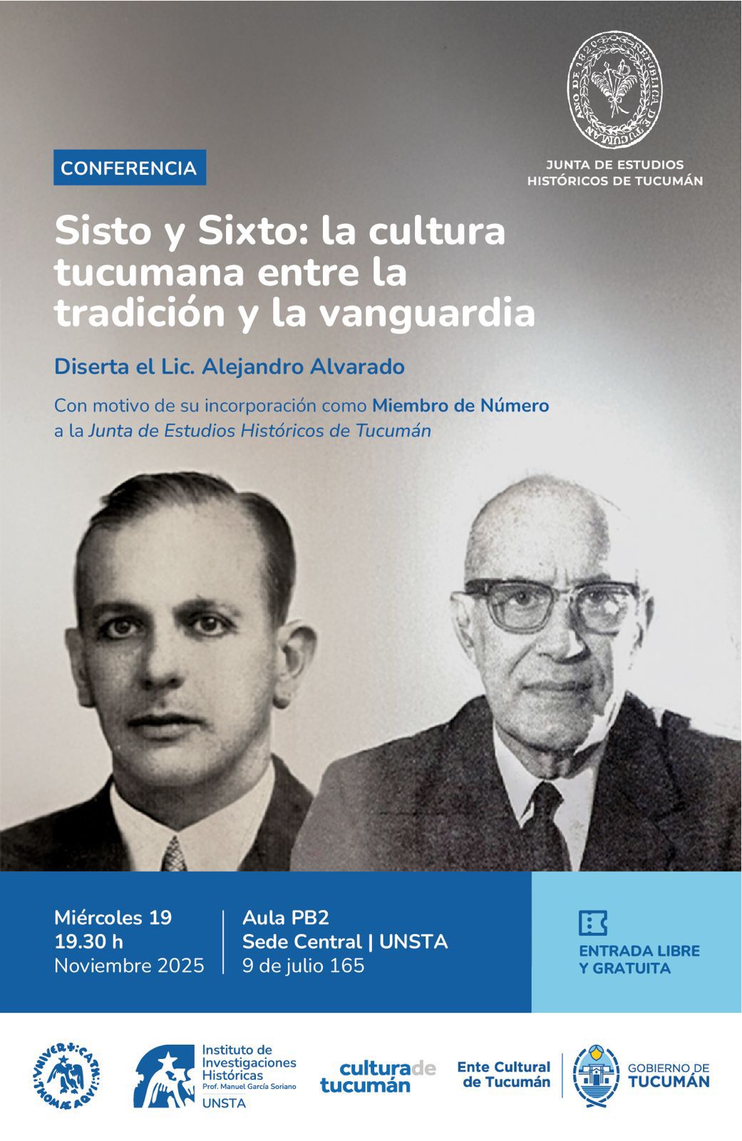 La Junta de Estudios Históricos de Tucumán presenta la conferencia “Sisto y Sixto: la cultura tucumana entre la tradición y la vanguardia”, a cargo del Lic. Alejandro Alvarado, en el marco de su incorporación como Miembro de Número. Un encuentro abierto para reflexionar sobre figuras centrales de la cultura tucumana.