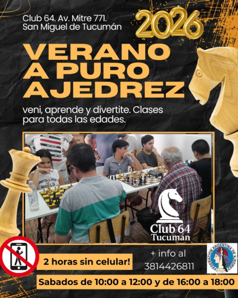 Enero a puro ajedrez en el Club 64: clases y actividades para todas las edades en San Miguel de Tucumán. Sábados con dos horarios.