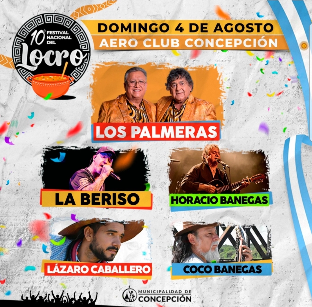 Este domingo 4 de agosto, el Aero Club Concepción será el escenario del esperado 10º Festival Nacional del Locro, organizado por la Municipalidad de Concepción. Entre las estrellas musicales que engalanarán el evento destacan Los Palmeras, La Beriso, Lazaro Caballero, Horacio Banegas, Coco Banegas y otros talentos más, que prometen hacer vibrar a todos los […]