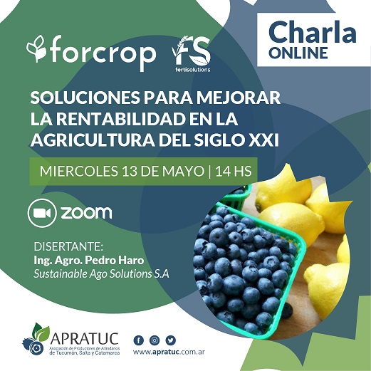Se realizará una charla online este Miercoles 13 de Mayo 2020 a las 14 hs por Zoom. La temática será: Soluciones para mejorar la rentabilidad en la Agricultura del siglo XXI. La Disertación estará a cargo del Ing. Agro. Pedro Haro de Sustainable Agro Solutions S.A. Charla dirigida a productores de Arándanos y Limón. Para acceder a […]