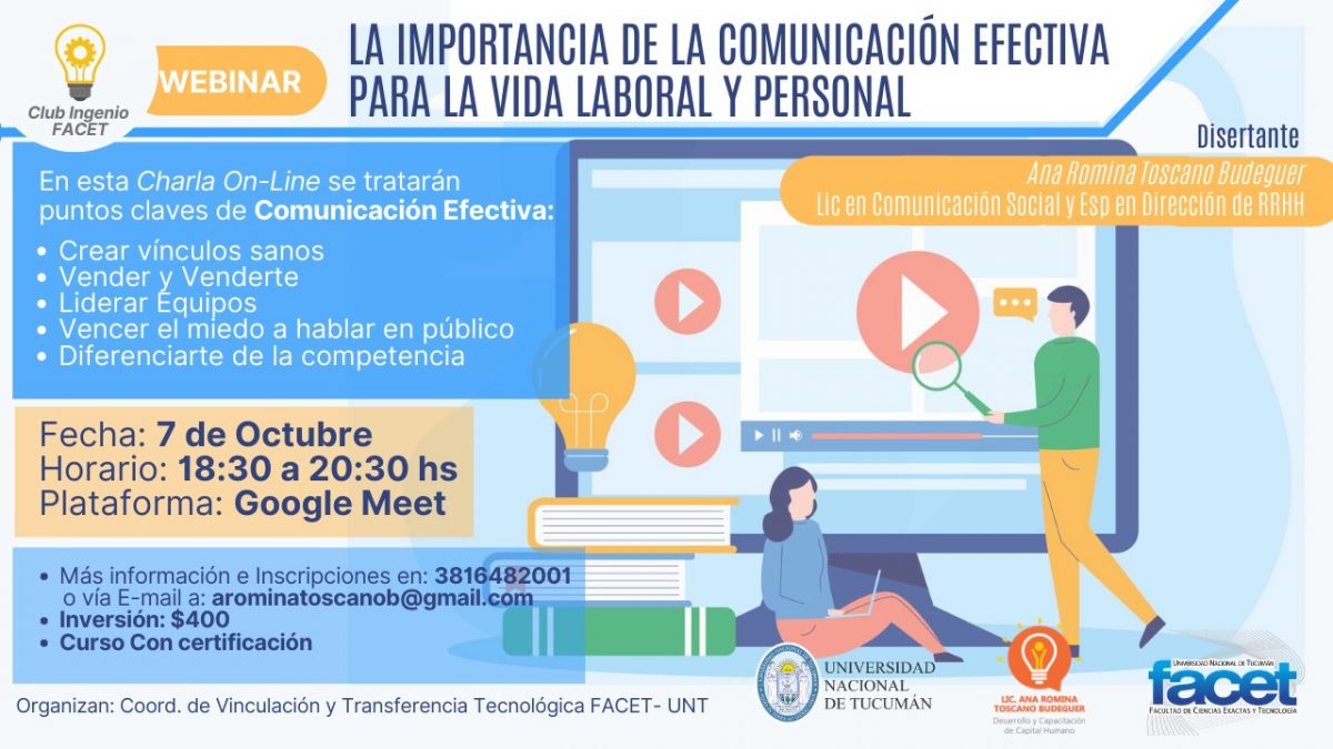 Curso – Taller: ” La importancia de la Comunicación Efectiva para la vida laboral y personal”. Disertante: Ana Romina Toscano Budeguer Títulos: Licenciada en Comunicación Social y Especialista en Dirección de RRHH Temario: ¿Para qué nos sirve la Comunicación Efectiva?: 1- Crear vínculos sanos 2- Vender y Venderte 3- Para Emprender 4- Liderar Equipos 5- […]