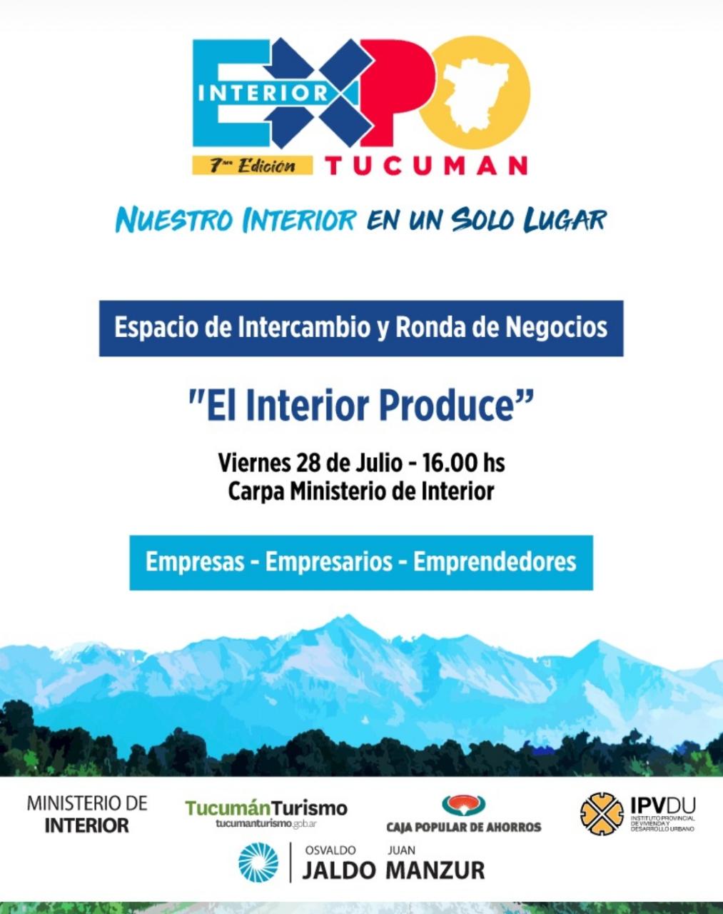 “El interior produce” un espacio de intercambio y ronda de negocios, en un solo lugar, te esperamos este viernes 28 de Julio a las 16:00 hs en Carpa Ministerio del Interior.