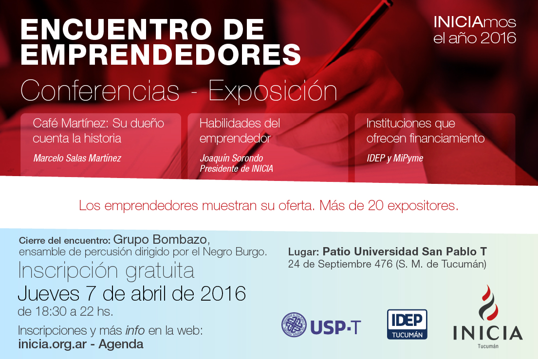 Vení a Iniciar el año con nosotros y a encontrarte con la Comunidad Emprendedora! En este encuentro te presentaremos el Calendario 2016 con actividades y eventos organizados en Tucumán para la comunidad emprendedora. El 7 de abril de 18.30 a 22 horas te esperamos en la charlas: “Habilidades del emprendedor”. Joaquín Sorondo Presidente y fundador […]
