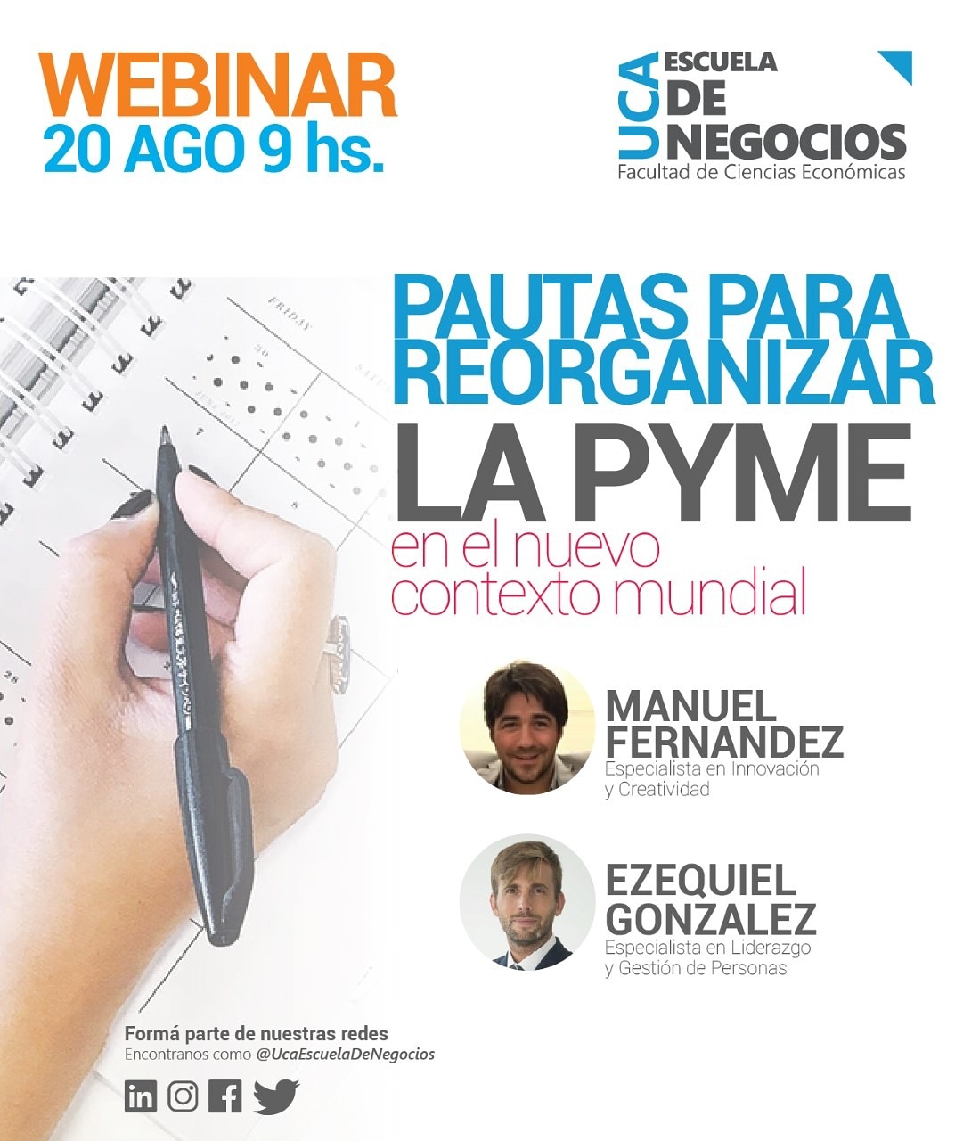 Webinar organizada por la Consultora Usinna en conjunto con la UCA ( Unniversidad Católica Argentina), de 9 a 10 hs, para repasar algunos tips y consejos respecto de la gestión de una PYME antes los cambios ocurridos por el efecto pandemia.