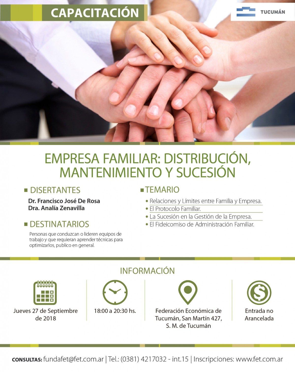 El Jueves 27 de Septiembre a las 18 hs se dictará el curso “Empresa familiar: Distribución, mantenimiento y sucesión”. Tendrá lugar en la sede de la Federación Económica de Tucumán, San Martín 427 – San Miguel de Tucumán.