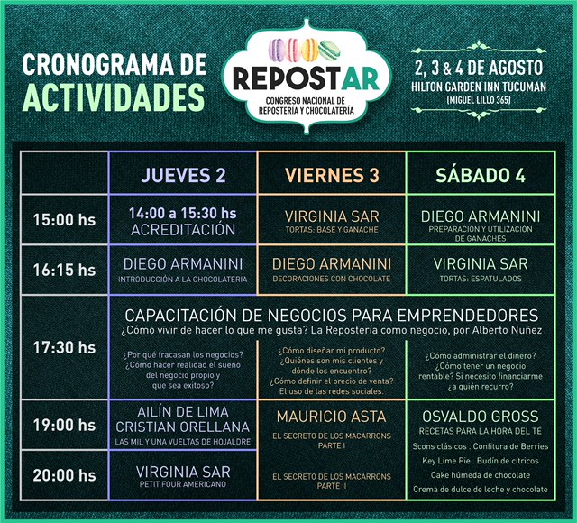 Agosto llega dulce a Tucumán. Del 2 al 4 de dicho mes se realizará Repostar, congreso nacional de repostería y chocolatería. Contará con expertos en la materia como Virginia Sar y Diego Armanini. Tendrá lugar en el Hotel Garden Inn, Miguel Lillo 365
