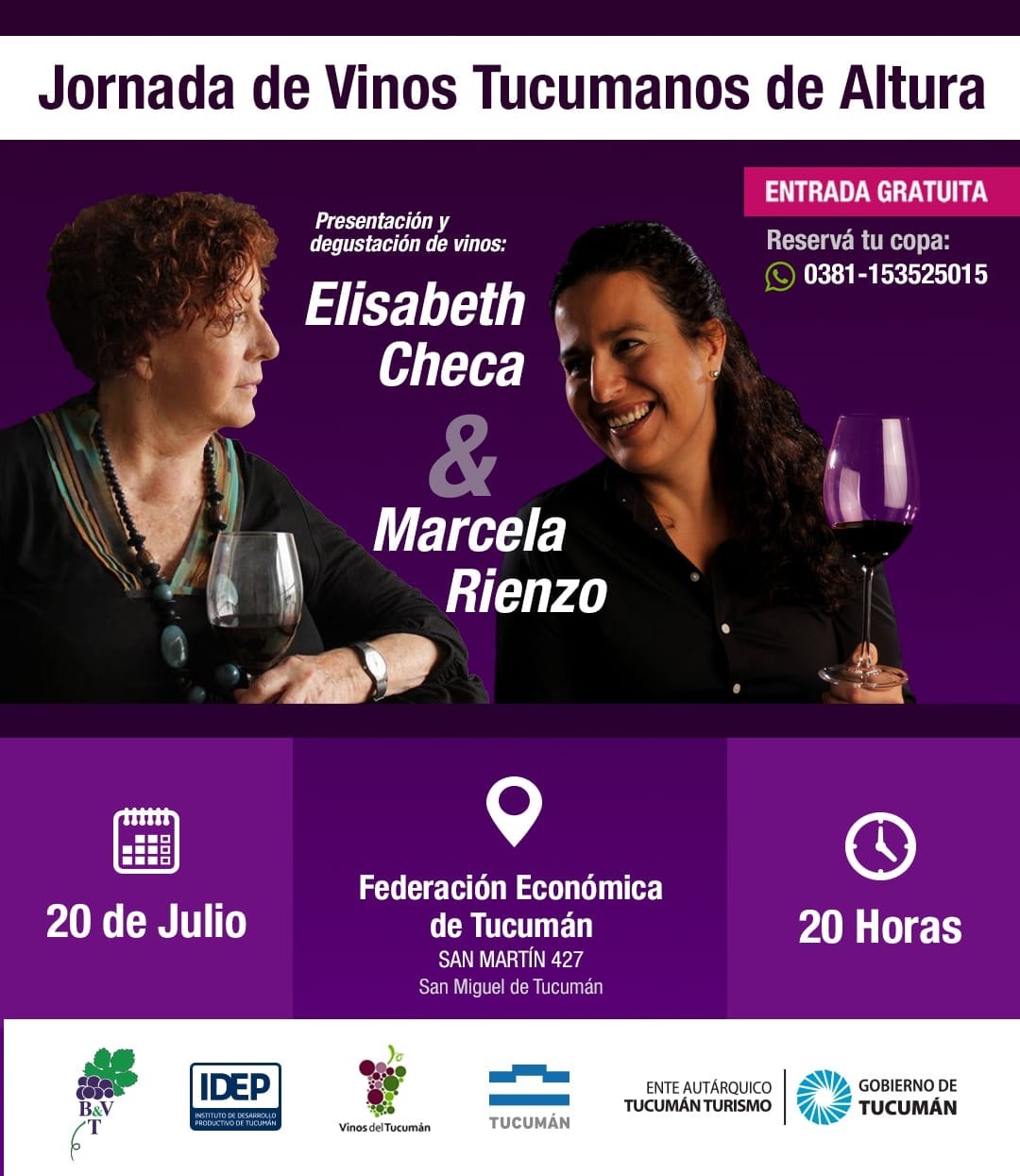 El 20 de Julio, día del amigo, se realizará la Jornada de vinos tucumanos de altura. Habrá presentación y degustación de vinos de la mano de las sommeliers Elizabeth Checa y Marcela Rienzo. Esta jornada tendrá lugar en la Federación Económica el 20 de Julio a las 20 horas. Entrada gratuita.