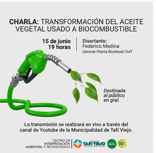 Hoy martes 15, a las 19:00 hs se llevará a cabo una charla sobre “Transformación del aceite vegetal usado a biocombustible”. La misma se transmitirá en vivo por el canal de YouTube de la Municipalidad de Tafí Viejo.