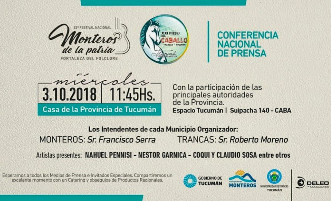 Del jueves 11 al domingo 14 de octubre se realizará el festival “Monteros de la Patria, Fortaleza del Folklore”. Este evento, el más grande de la localidad de Monteros, contará la presencia de las principales figuras del folclore y la música popular del momento. El jueves 11 abrirá el telón Luciano Pereyra junto con Los […]