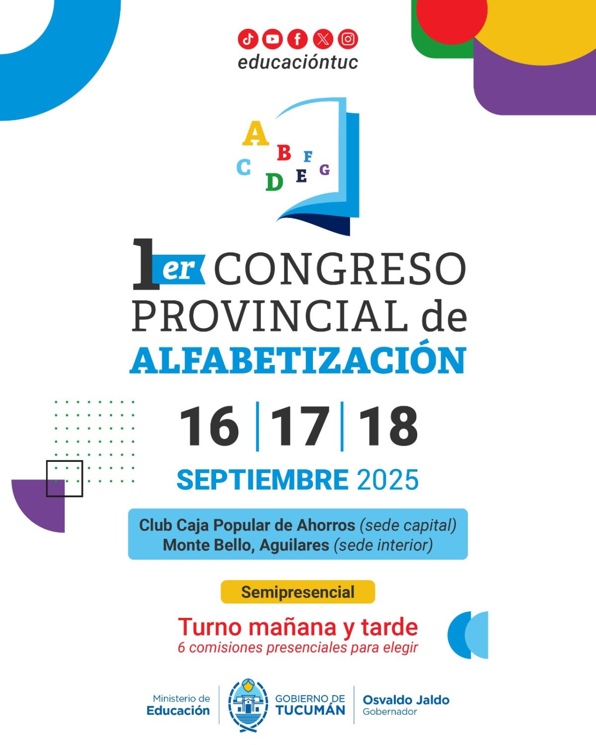 Del 16 al 18 de septiembre de 2025 se llevará a cabo en Tucumán el primer Congreso Provincial de Alfabetización, con actividades presenciales y virtuales en doble turno.