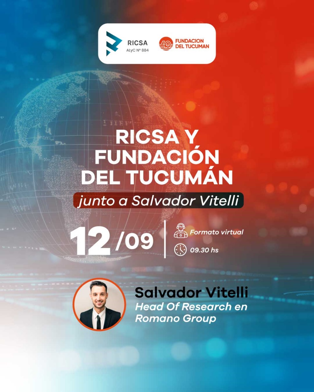 RICSA y Fundación del Tucumán realizaron el 12 de septiembre un encuentro virtual con la disertación de Salvador Vitelli, Head of Research en Romano Group. La jornada brindó un análisis actualizado del contexto económico y financiero, convocando a profesionales y empresarios de la región.